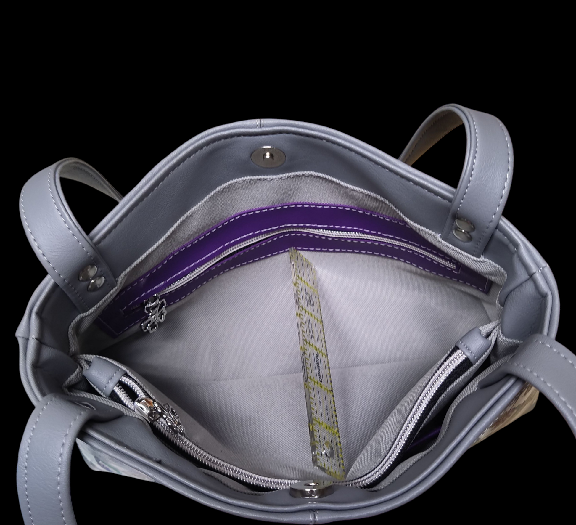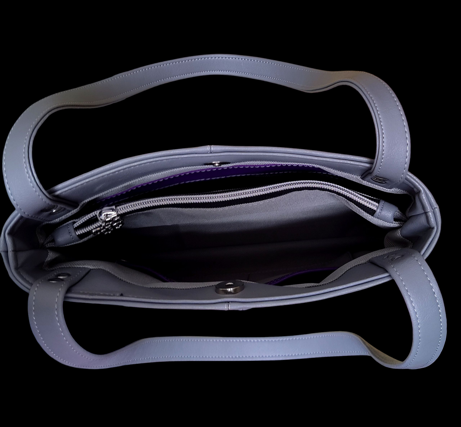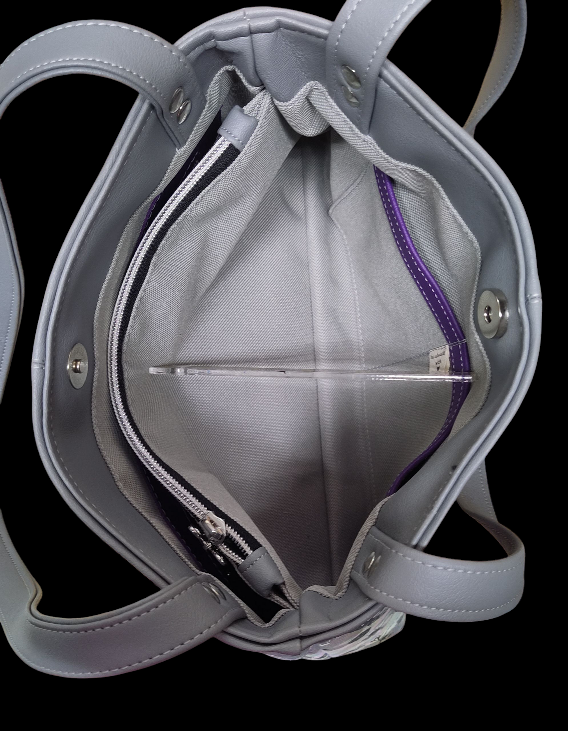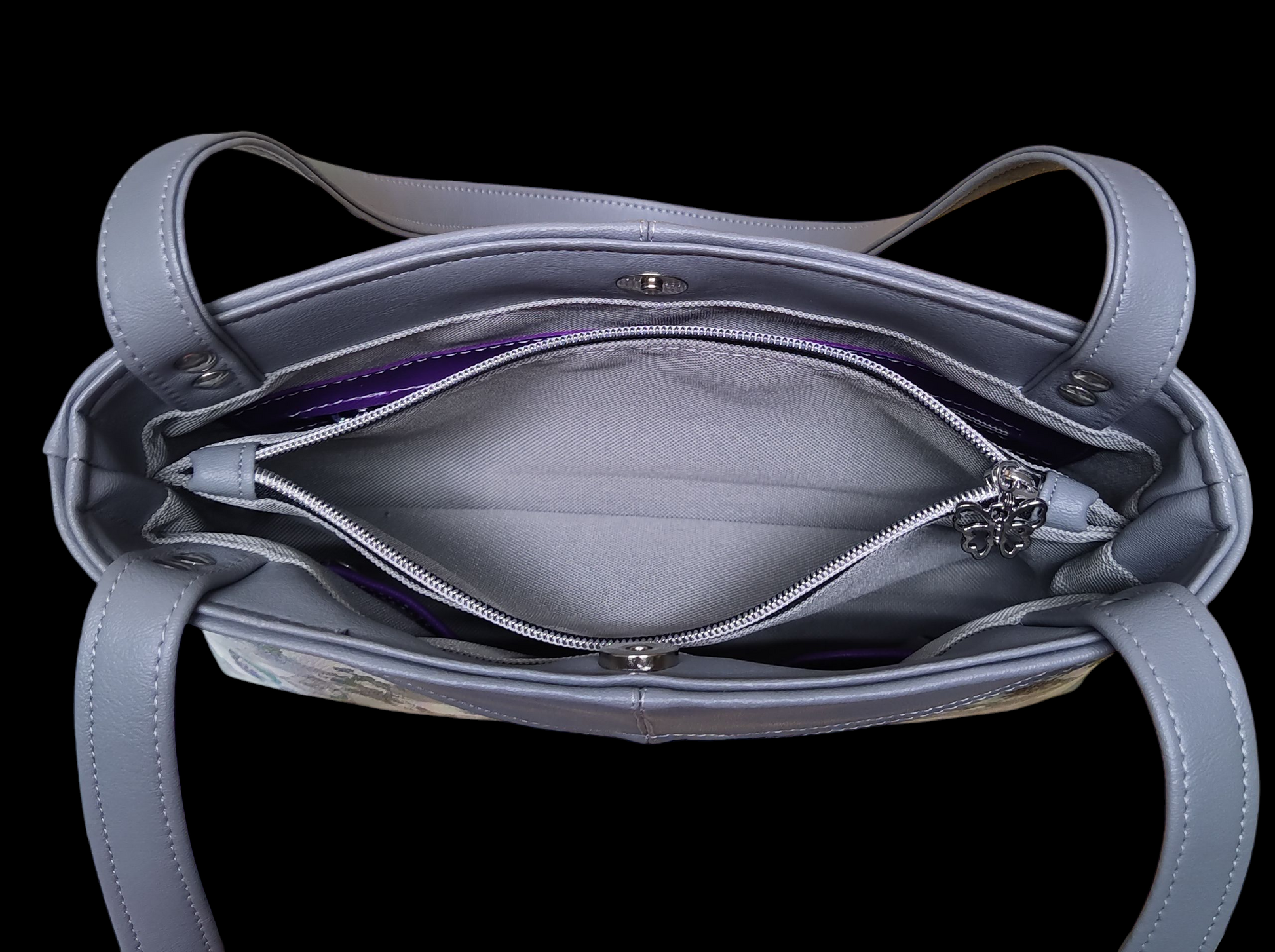 Introducing the Sweetheart shoulder bag. A roomy purse to carry & organize your essentials. Features include a spacious interior with a zipper pocket and a double slip pocket as well as a large zippered interior divider pocket. Two attached straps that allow you to carry this as a shoulder bag or a handbag. The exterior is constructed of a solid gray vinyl & a butterfly print. The interior is a gray waterproof canvas. All hardware is silver with two cute butterfly zipper pulls. A magnetic top closure. Lovingly handmade by myself.